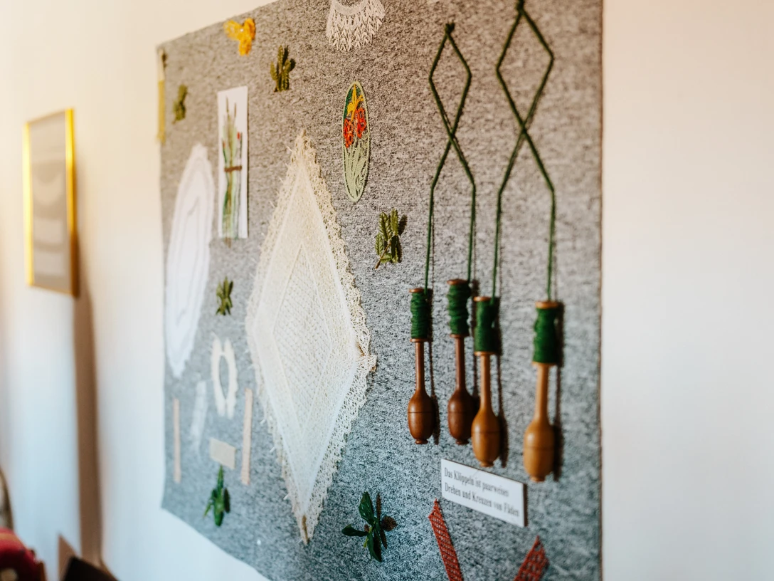 In bobbin lace-making, numerous threads are attached to small wooden "bobbins" and systematically twisted, linked and intertwined. This is how the filigree lace is created, into which symbols are often worked. The heart as a sign of love is often found as a central element in bobbin lace. Crosses, the lamb of God, the eye of God or even angels are often incorporated as symbols in lace used in a religious context. Classically, bobbin lace is made in white, cream or black, but nowadays coloured threads are also used.