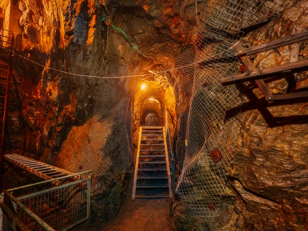 The shaft, which is 810 metres deep in total, is the last of its kind in the Harz Mountains and is still open. Two water wheels and a reversing wheel can be seen above ground. The impressive highlight of a guided tour of the Samson mine is a faithfully reconstructed artificial wheel with a diameter of 12 metres, which is used to drive the "Fahrkunst". Today, the wheel is the last of its kind. It is made of steel cables and is still regularly used today down to a shaft depth of 190 metres.