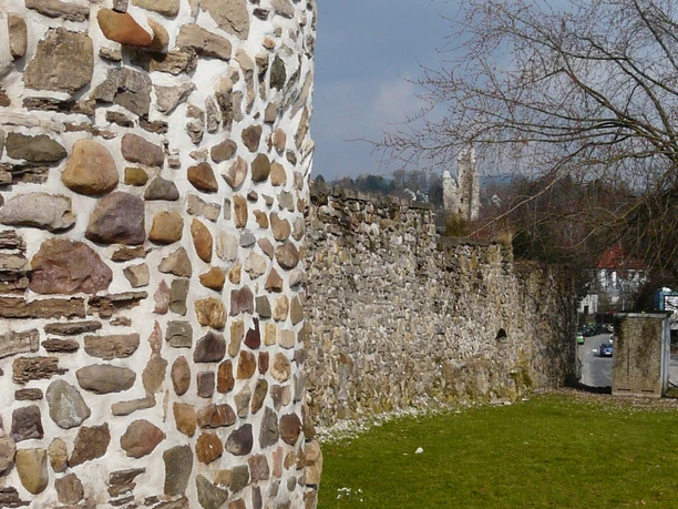 We turn right and pass the railway crossing. Past the vocational school, after about one hundred meters, we reach the "city wall", first mentioned in 1233. It was built from roughly hewn large river cobbles from the Söse, which are composed of quartzite from the Acker-Bruchberg. Gypsum was used as a binder. In the gypsum mortar joints of the city wall, plants typical for the rock vegetation of the Osterode gypsum areas settle.