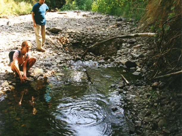Descending the path, passing a fire-fighting pond and carefully crossing the road, we arrive at the "Devil's Baths". Ponds and marshy depressions are remnants of intensive leaching of Werra anhydrite. Today, these ponds and swamp areas form valuable biotopes. The area of the Devil's Baths with the Quellerdfall Devil's Hole is under nature protection. Please stay on the path.