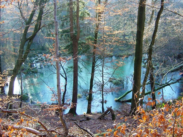 The Karstwanderweg leads into the Hainholz nature reserve with well-developed karst phenomena on a very small area: karst spring, cave, episodic sinkhole pond, karst cone, sinkholes, karst springs and swallow holes.