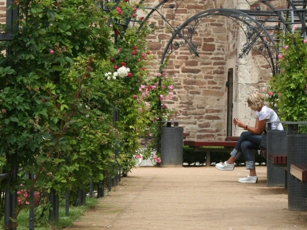 After a short stretch along allotment gardens, the path leaves the pleasure garden and turns right past a shelter, across a street towards the Hotel am Schlosspark. An information board provides details about the animal park/Agnesberg. Along the animal park wall, the path turns left shortly before the silver fir to Marienweg, and after a short steep ascent, the Agnesberg viewpoint is reached. The descent to the castle leads over switchbacks and stairs. After a visit – also to the terrace gardens – a path from the castle hollow branches off to the right downhill and circles the castle hill towards the town. A left turn leads to the Blumenweg viewpoint. This path continues without elevation change to Rosenwinkel. At the end of this idyllic lane lies the pleasure garden again, where the circular path closes and leads back to the parking lot by the familiar way.