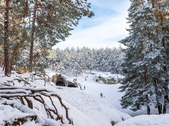 Set in fragrant pine forests that resemble Brandenburg forests or the Baltic Sea coast more than the Harz, you will find an extraordinary hiking area here. Especially the sandstone caves, photographed thousands of times and about the size of a soccer field, exert a strong attraction on families, mystics, stamp hunters, film crews, romantics, and hikers. It is no coincidence that this place was chosen as the most beautiful stamp point of the “Harzer Wandernadel” in 2009.