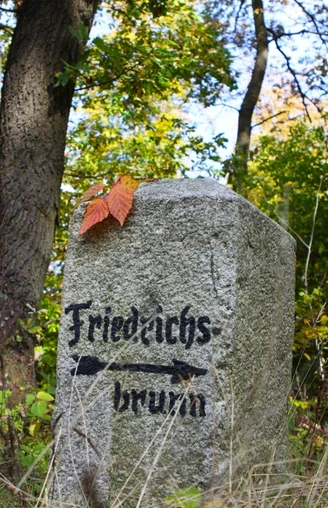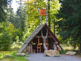 Hier halten Sie sich rechts um nach ca. 100 Metern nach links auf die Ausfahrtstraße des Hexentanzplatzes zu biegen. Dieser folgen Sie ca. 400 Meter bis hinter die Straßenkurve und biegen dann rechts auf den Waldweg ab. Nach wenigen Metern zweigt an einer Kreuzung der Wanderweg nach Friedrichsbrunn (Markierung gelbes Quadrat) ab, dem Sie nun folgen. Nach der zweiten Überquerung der Friedrichsbrunner Chaussee erreichen Sie die Schirmbuche mit Schutzhütte. Von hier sind es noch knapp zwei Kilometer bis Sie das Zentrum von Friedrichsbrunn mit zentralem Wanderwegschilderbaum und Bushaltestelle erreichen.