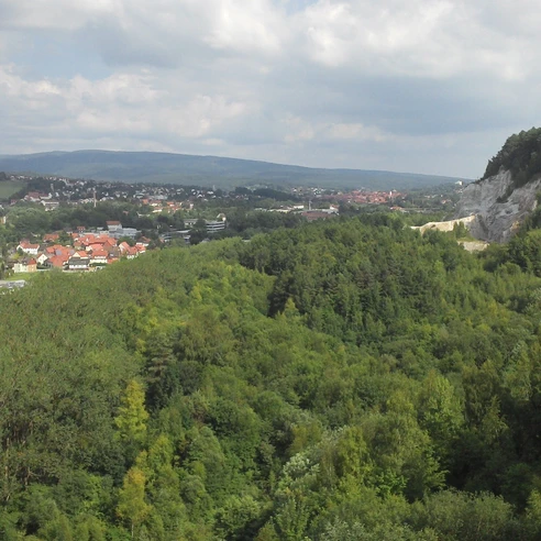 Gleich nach dem großen Quellteich geht es linker Hand in die Ortslage Förste mit zahlreichen weiteren, z.T. salzhaltigen Quellen und wieder hinaus in die Feldmark. Hier werden Sie vom 262 m hohen Lichtenstein begrüßt. Sie gelangen in einen Karstbuchenwald. Unter den hohen Laubkronen wachsen am Boden viele wertvolle Bodenpflanzen, die im Frühjahr den Waldboden in einen blühenden Teppich verwandeln. Vorbei am verschlossenen Eingang der Lichtensteinhöhle (Natur-/Kulturdenkmal) steigen Sie nach ca. 300 m links hinauf in den Wald. Sehr tiefe Erdfälle begleiten Sie auf beiden Seiten während des Anstiegs. Der Karstwanderweg führt im weiteren Verlauf auf die Kuppe aus Unterem Bundsandstein. Dort können Sie den Abhang im Buchenwald unter der Burgruine Lichtenstein zu einer Rast nutzen oder die vereinzelt noch zu findende Mauerreste und Burgwälle suchen.