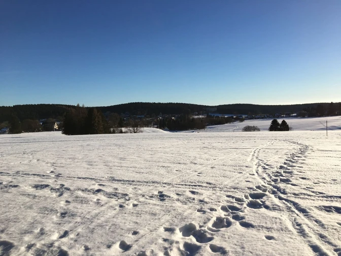 Hier biegen Sie rechts ab in die Straße "Auf der Höhe" und folgen bitte ab hier den Wegweisern zur Loipe. Parallel der Loipe führt ein gewalzter Winterwanderweg Richtung Loipenstation. An der Loipenstation vorbei gehen Sie weiter in Richtung Köte. An der Köte dann bitte links abbiegen.