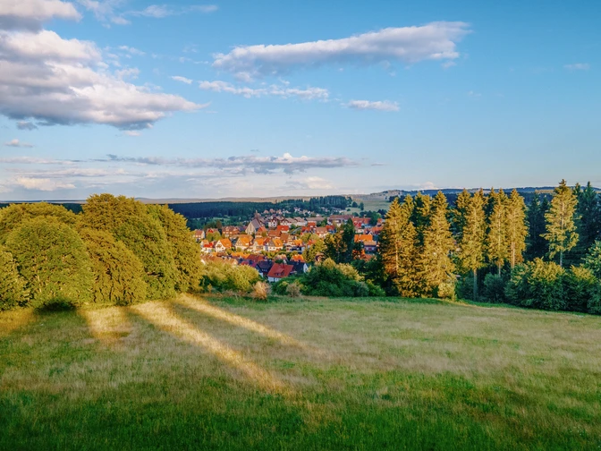 Wir kommen an der Jugendherberge vorbei, wo sich dann wieder an einer großen Wiese (auf der u.a. das geschützte Arnika blüht) entlang ein schöner Blick auf Südbraunlage eröffnet. Nach Überquerung der Bundesstraße gehen wir am Friedhof vorbei und erreichen eine Platz mit einer Köhlerhütte. Hier wurde viele Jahre lang regelmäßig ein Holzkohlenmeiler aufgebaut, angezündet und später geerntet. Dies erinnerte an die Zeit Braunlages als Hüttenort, wo das Erz in Hüttenwerke durch Holzkohlefeuer in Metallprodukte verarbeitet wurde.