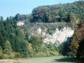 Weiter geht es über die Halde des Dolomit-Steinbruches an der Wolfskuhle, aus dessen Lagerstätte vor 800 Jahren die Werksteine für das Kloster Walkenried gebrochen wurden. Es sind feine dolomitische Ablagerungen in einer ehemals tropischen Lagune.