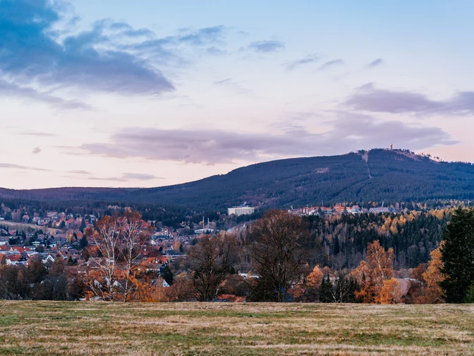 Auf dem Hasselkopf Panorama-Blick über Braunlage mit Achtermann, Brocken und Wurmberg im Hintergrund.