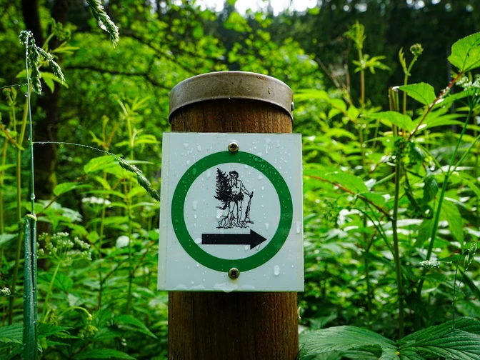 Der blaue Stempel auf Wegweisern des Harzklubs markiert die richtige Strecke.